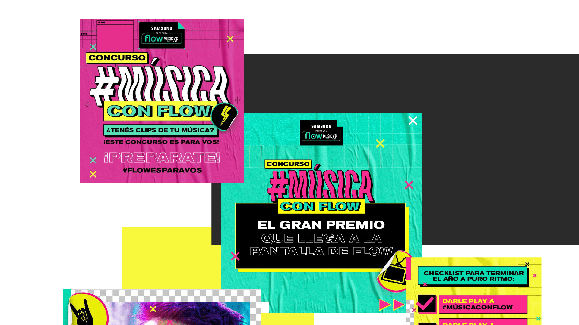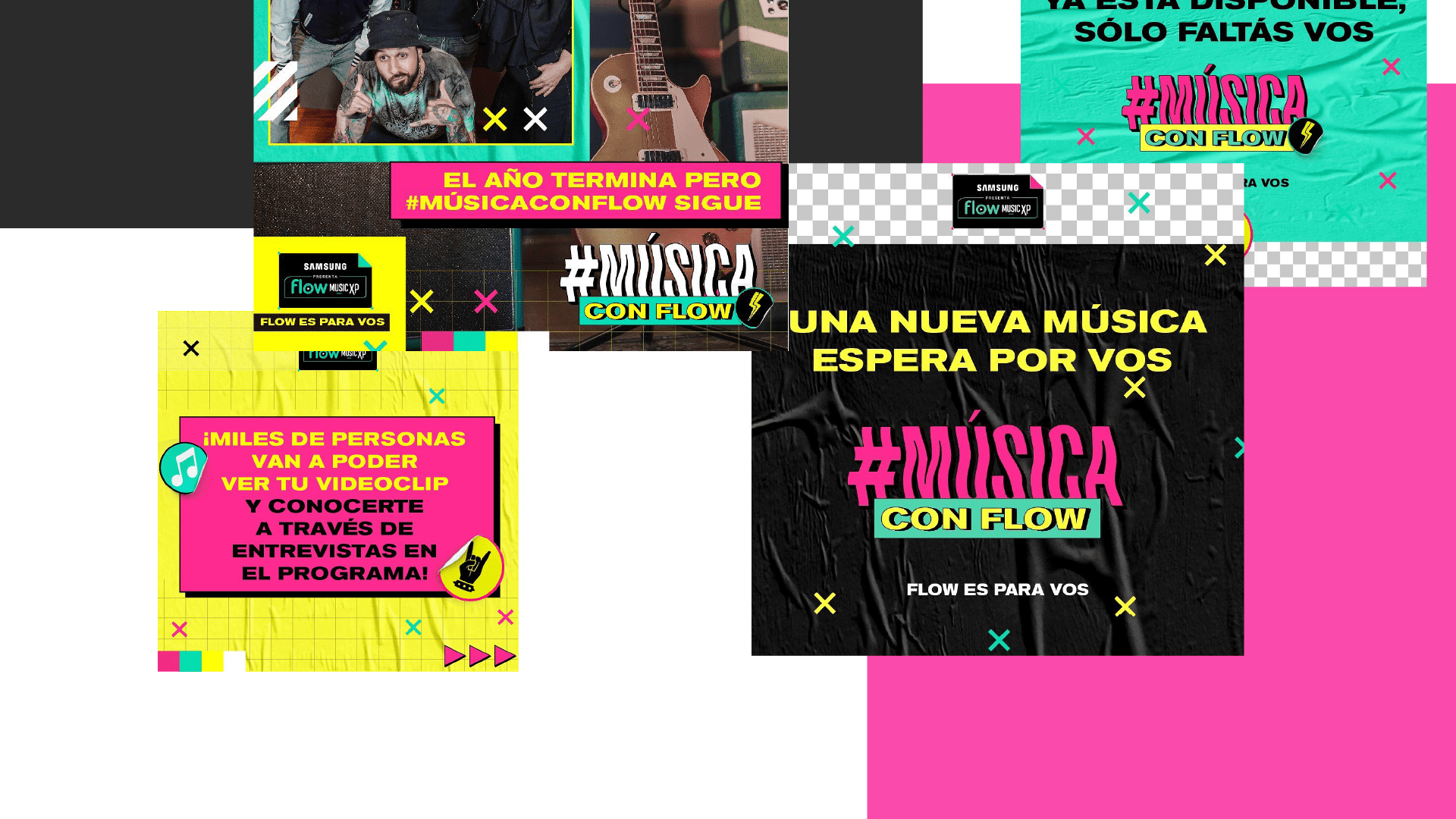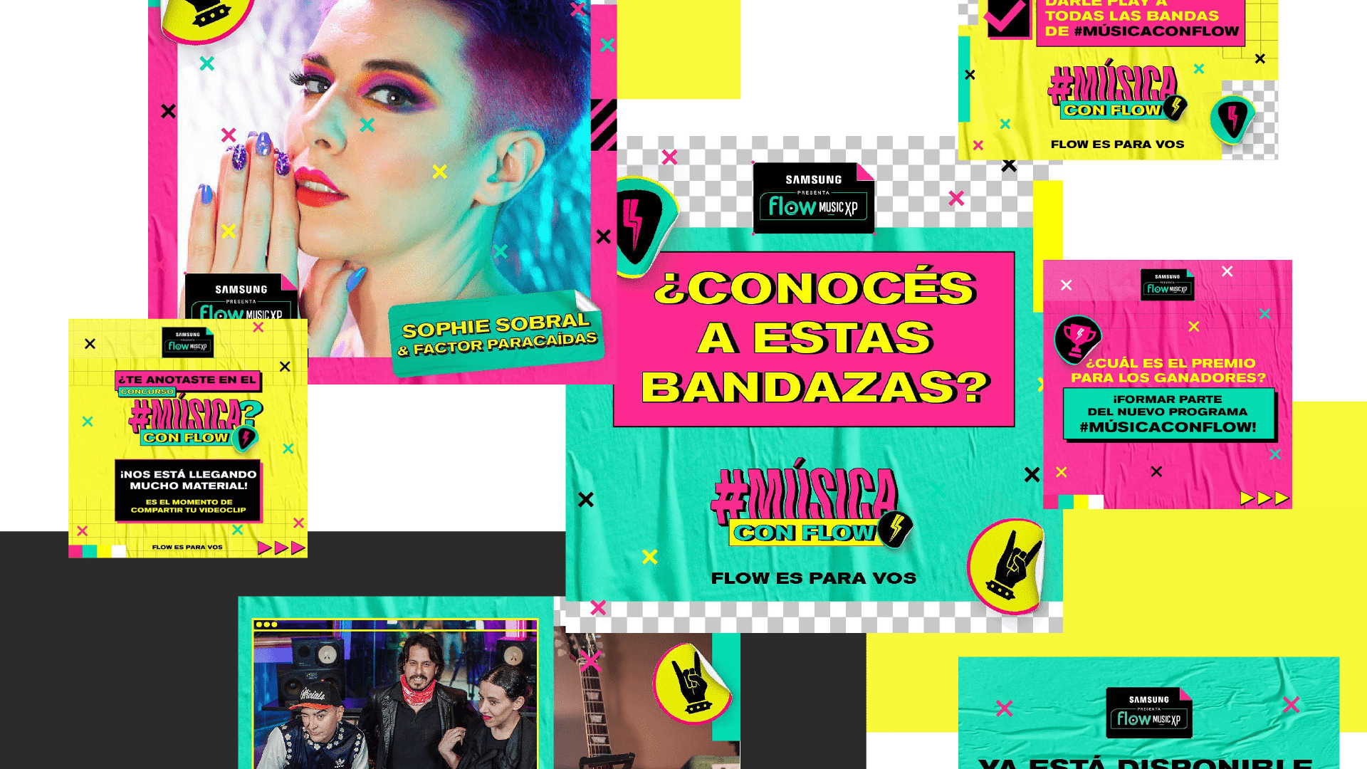 To introduce #MúsicaConFlow, an original show and contest from Flow where emerging bands and solo artists submit their music videos, I created the identity and visual ecosystem around the project.